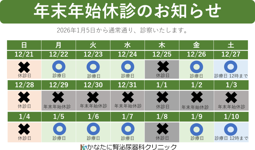 2025年12月27日(土)まで、および2026年1月5日(月)からは午前診・午後診とも通常どおりの診療時間となります。